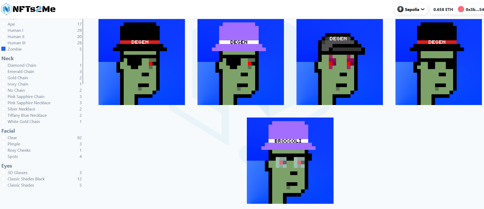 Then, on the left side, you will see the number of NFTs that have each trait for every layer. You can select a trait, or multiple traits, and the NFTs containing those traits will be displayed in the center. You can see an example in the image below. We have filtered by 'Type: Zombie':