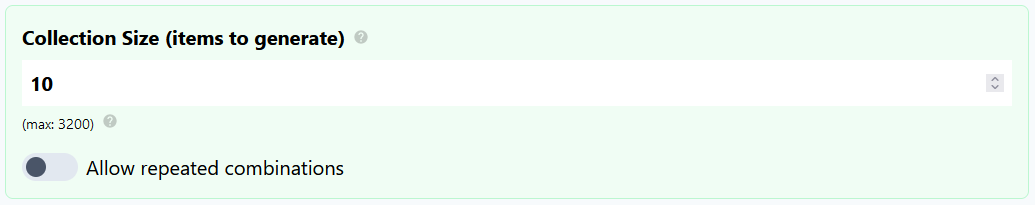 * **Collection Size**: The application calculates the maximum number of distinct combinations it can generate based on the number of layers and images. You can set a collection size between 1 and that maximum.