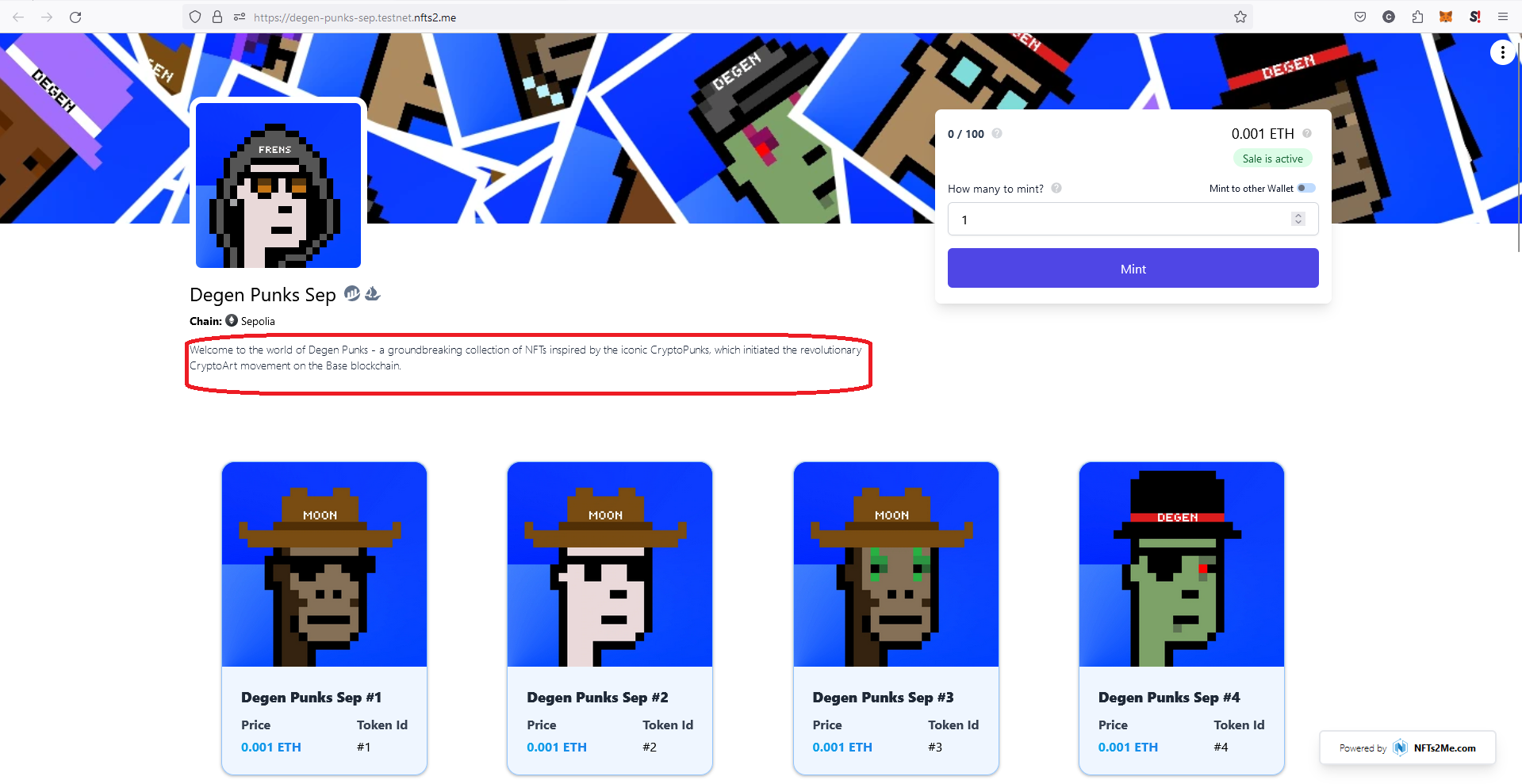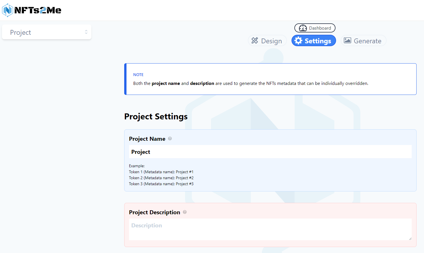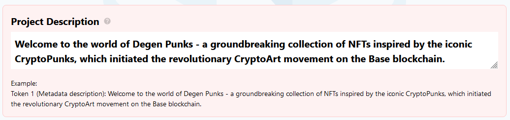* **Project Description**: This will serve as the general project description displayed on the minting page. Additionally, we use this description for individual token descriptions. You will have the option to modify specific token descriptions to achieve different descriptions for each token.