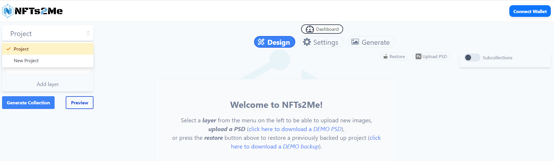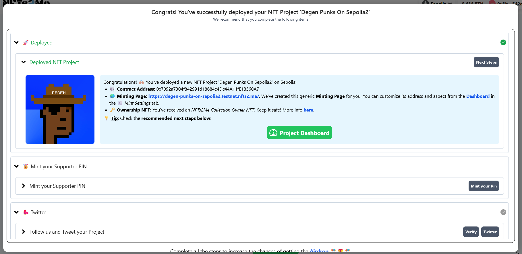 If you're unsure about the distinctions between the three types of collections, please visit the '[Initial Steps](https://docs.nfts2me.com/create-and-deploy-nft-collection/initial-steps)' section for clarification. Create the project that best suits your needs!