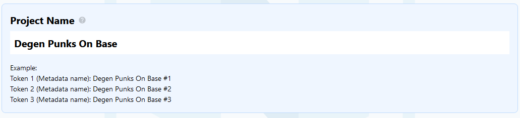 * **Project Name**: That's your collection name. Please set a descriptive name for your colection at the chain contract. Please note that we will also use that name to generate your collection name, which will be displayed on your minting page, and when someone mints any NFT, marketplaces will also display that name. Furthermore, we will generate a subdomain name based on it. Also it will be displayed for you to manage your collections on the NFTs2Me dashboard.