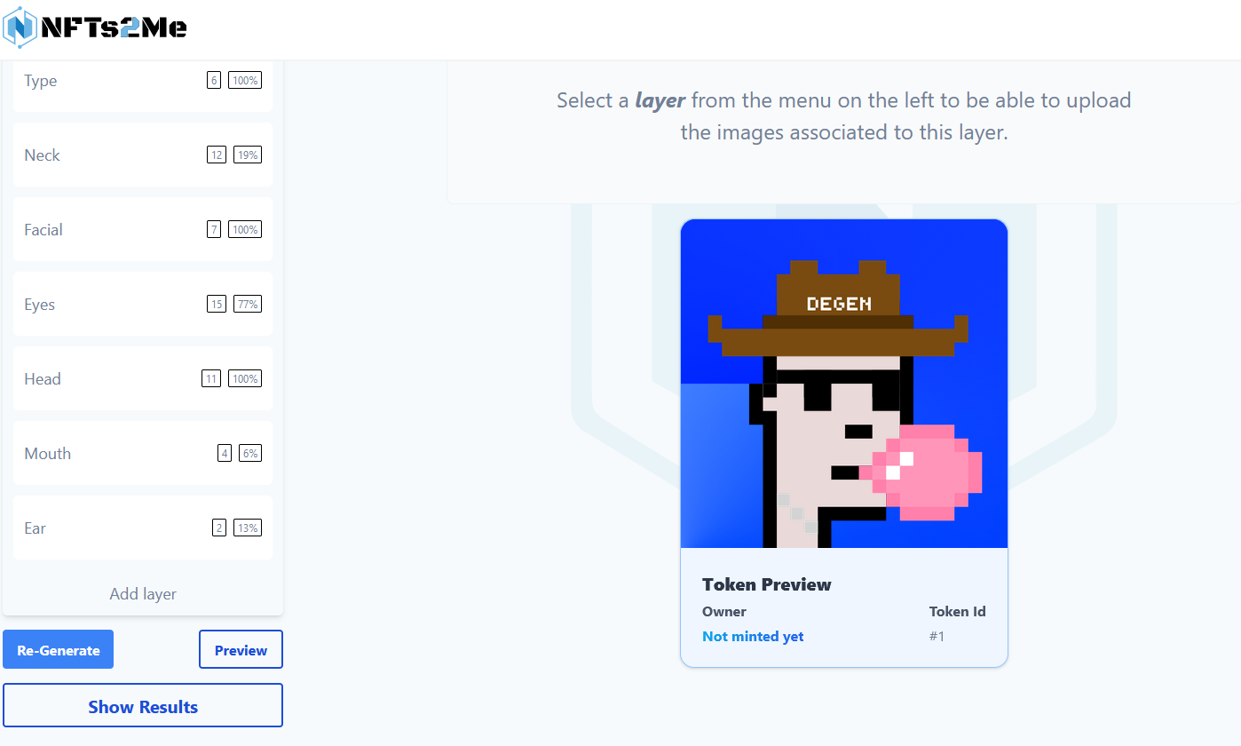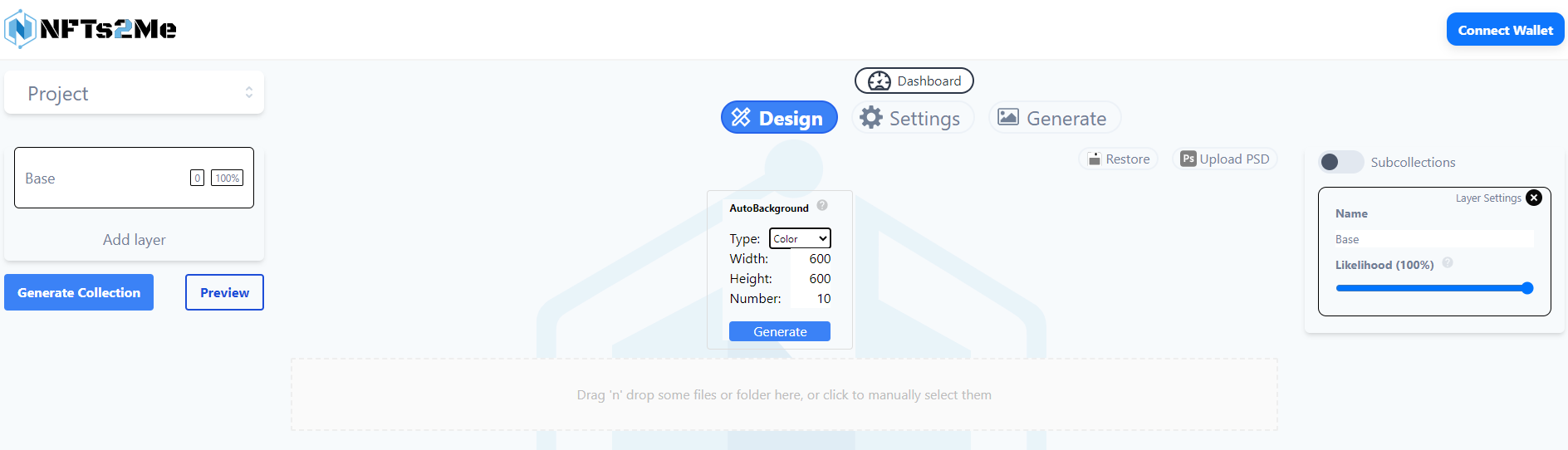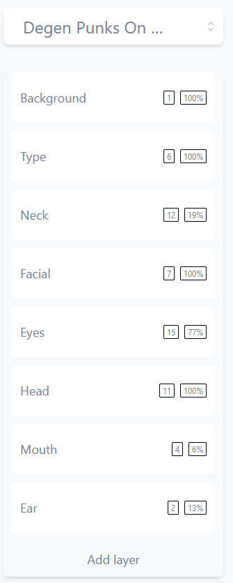 This type of project allows you to add layers to your collection and combine them with the number of combinations you choose, creating an image and NFT for each combination. Additionally, it adds metadata related to the information of the layers that compose it and their rarity.