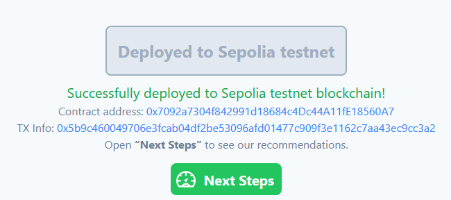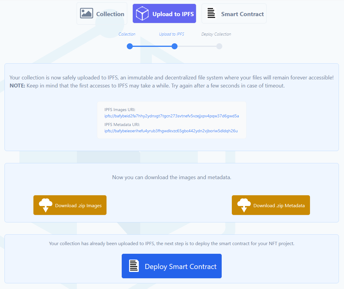 If everything has gone well, it will display the IPFS URI of the images and metadata. You will also have the option to download both the images and the metadata. The next step is to deploy the smart contract. Press the button or the tab to perform that action.