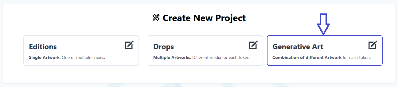 To create an "Generative Art" project, choose the third option labeled "Generative Art" on the NFTs2Me no-code app.