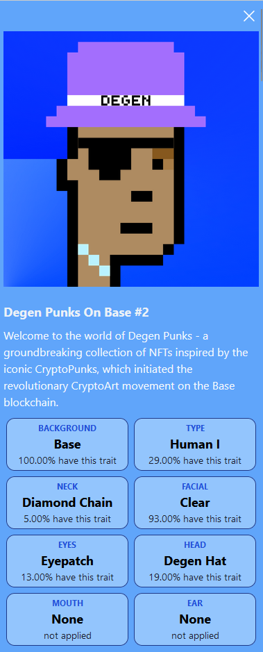 You can click on an NFT to display its details in the right zone. We have generated a trait for every layer and detailed the rarity of that trait:
