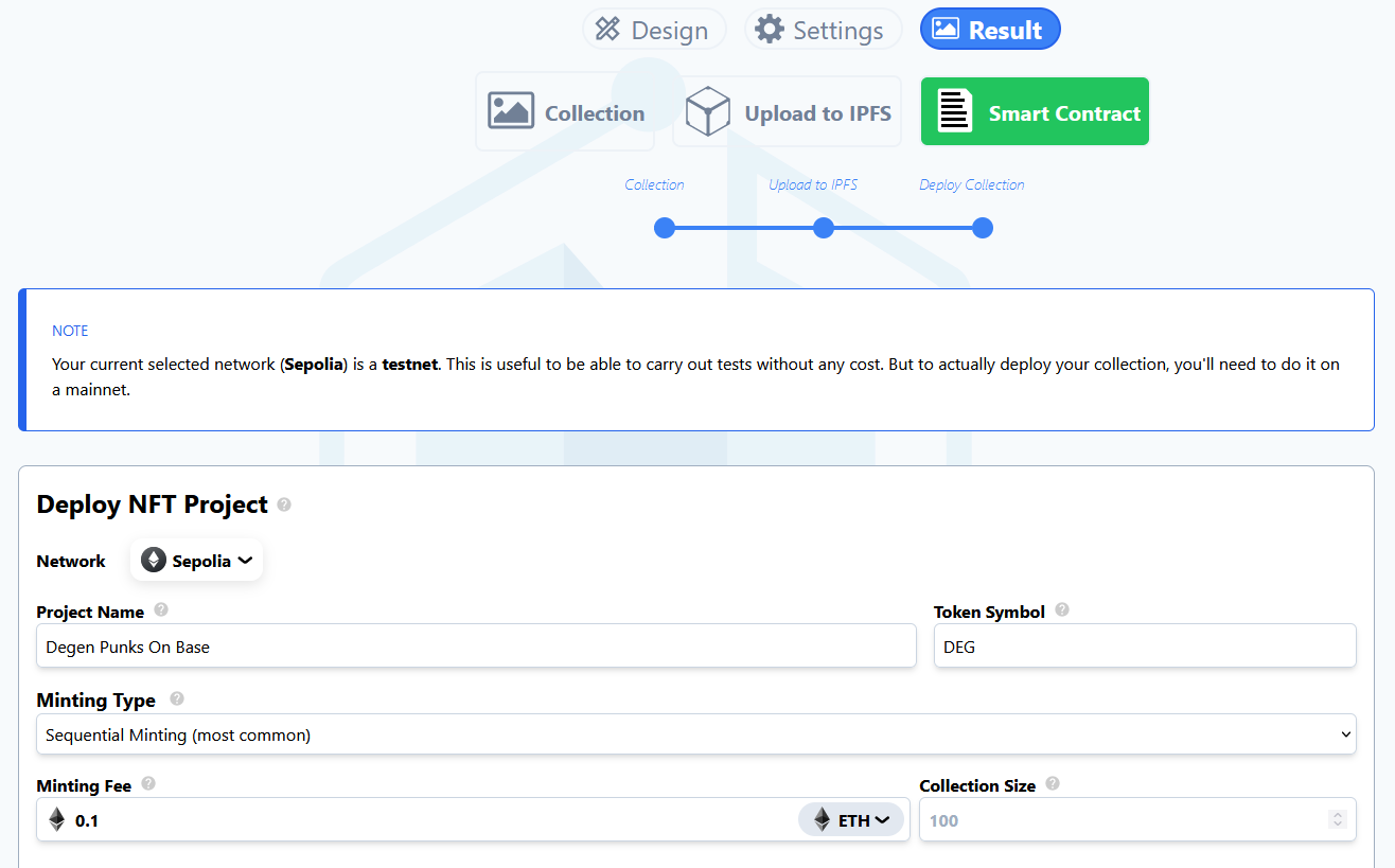 Once you have all the layers and images configured, and the collection settings established, the next step is to generate the combinations and deploy the smart contract for the NFT collection