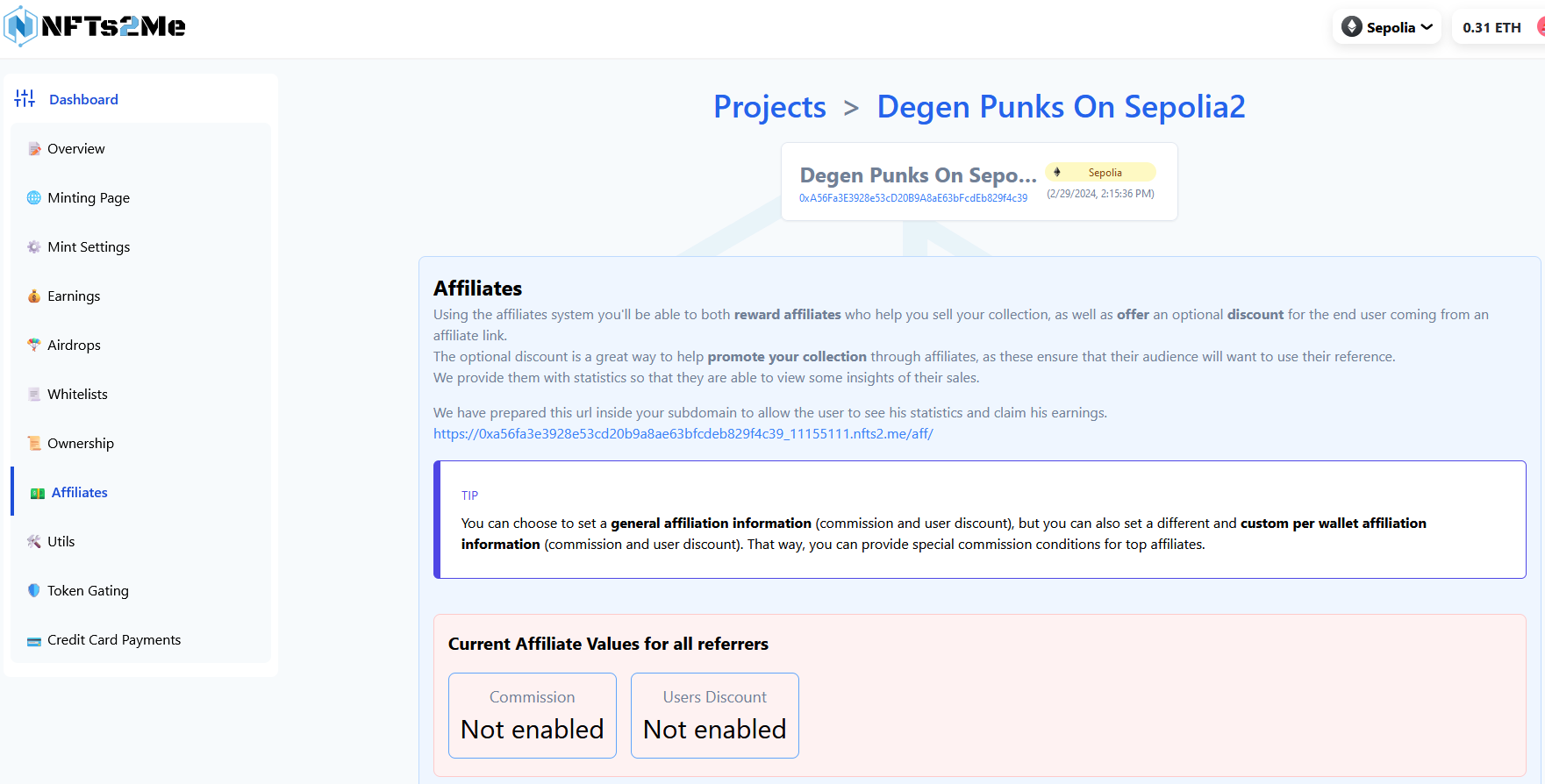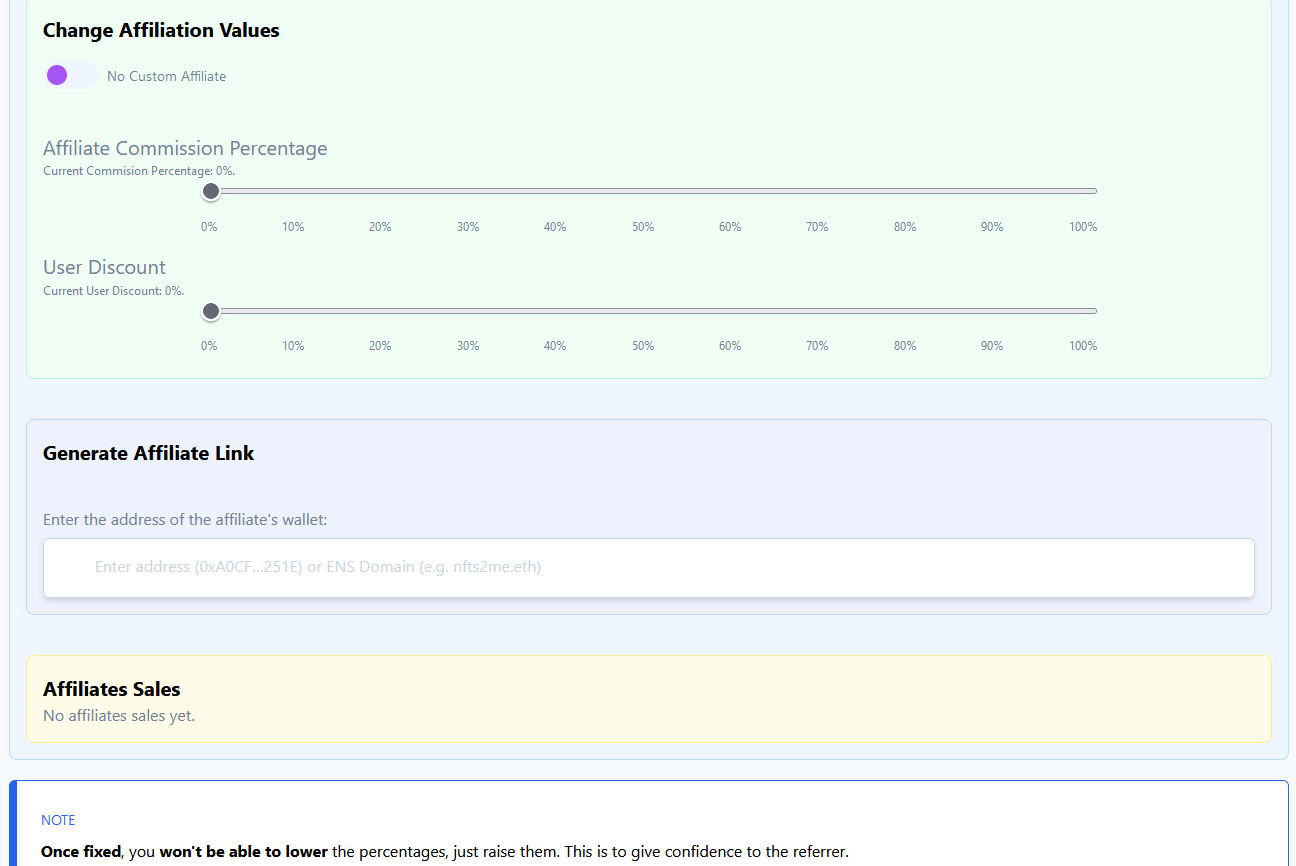 For further information, please refer to the '[Affiliates](https://docs.nfts2me.com/features/affiliates-system)' section.