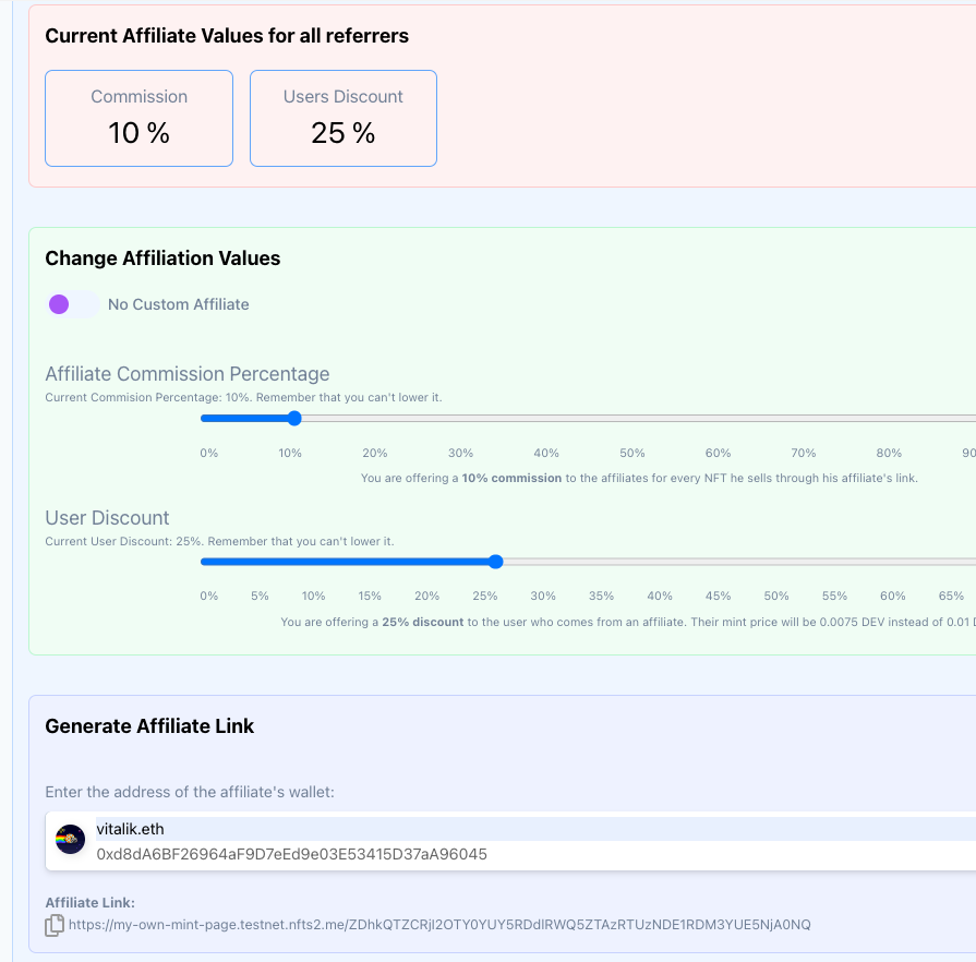 Using the affiliates system you'll be able to both reward affiliates who help you sell your collection, as well as offer an optional discount for the end user coming from a affiliate link.