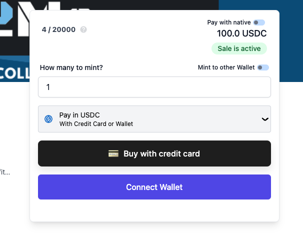 You can check a live example of FIAT / Credit Card payments with USDC at <https://starter_booster_pack_polygon.nfts2.me/>.