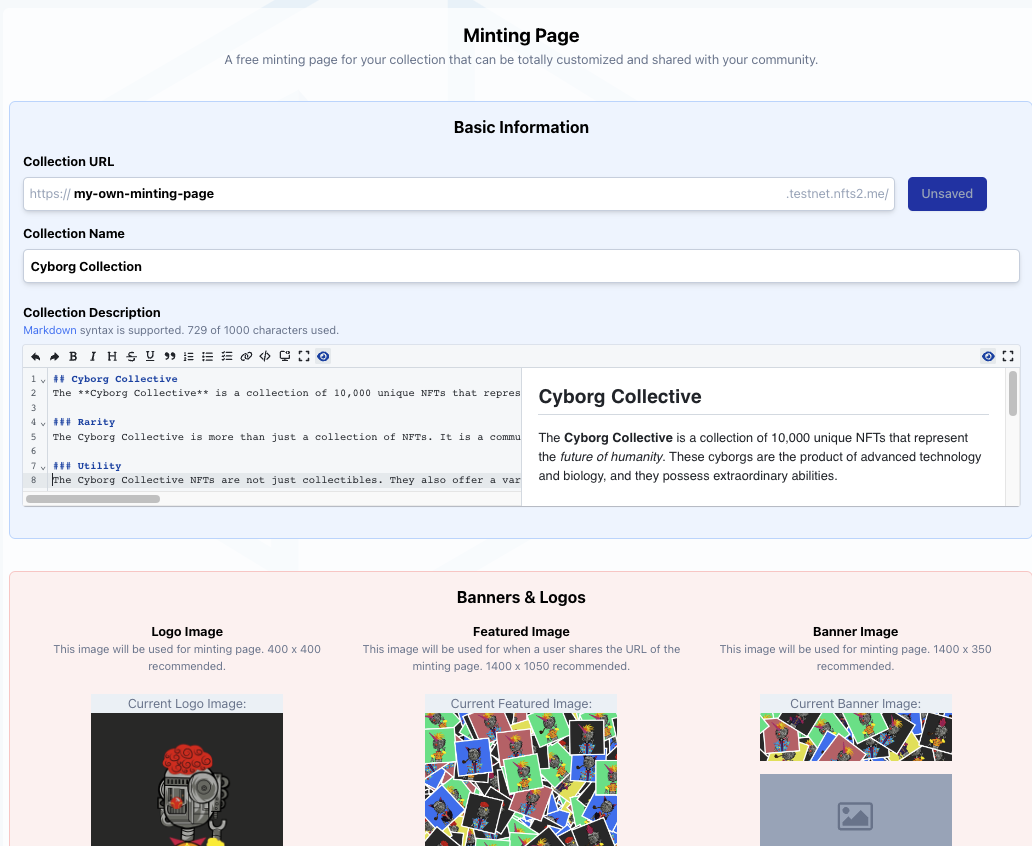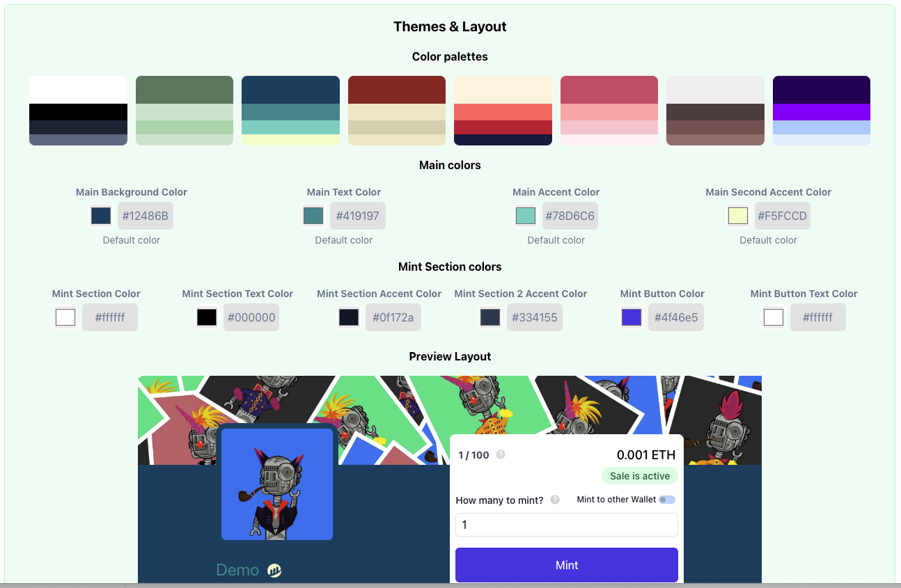 You can play around with the different options and try out how your Minting page looks until you find the result you expect.