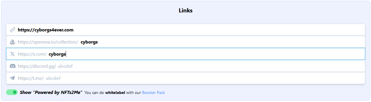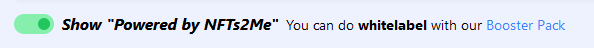 **Create** your own **white-label brand**. The "**Show Powered by NFTs2Me**" option **can be disabled** if you hold a NFTs2Me Booster Pack. Read about the benefits of having a [Booster Pack](https://nfts2me.com/booster/)