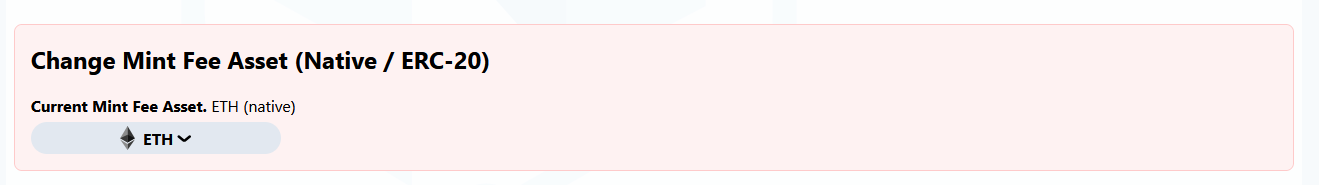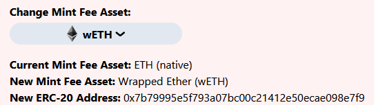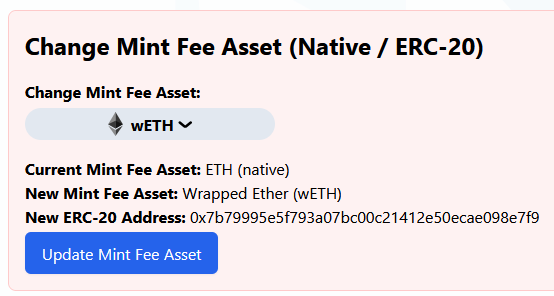 Scroll down to the Change Mint Fee Asset area. Here, you will see the currently selected token or currency being used as the mint fee asset (e.g., ETH or any ERC-20 token).