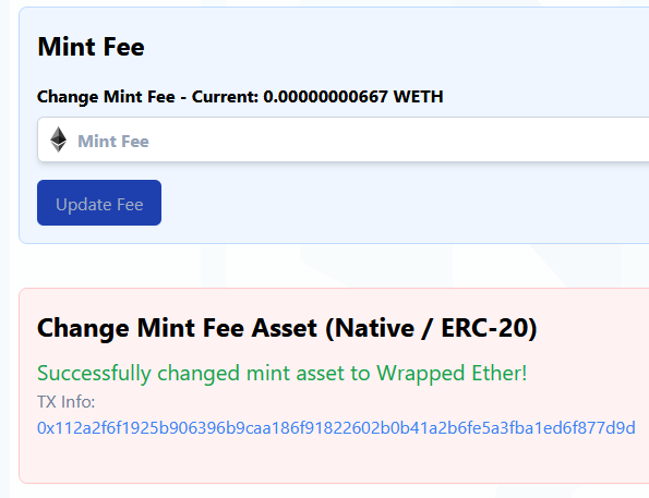 If everything goes well, you will see a confirmation message indicating that the mint fee asset has been successfully updated.