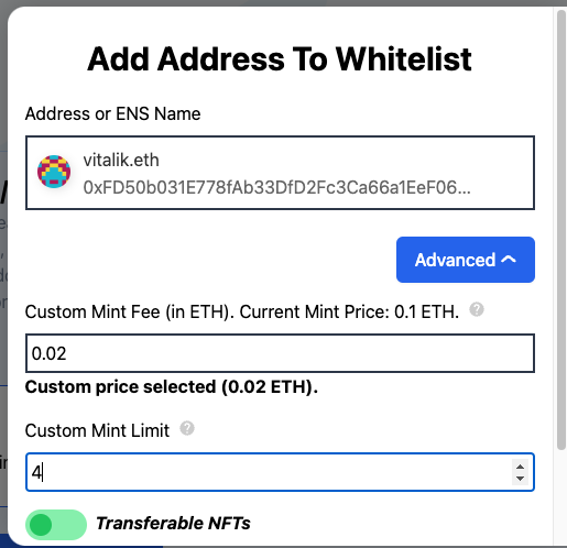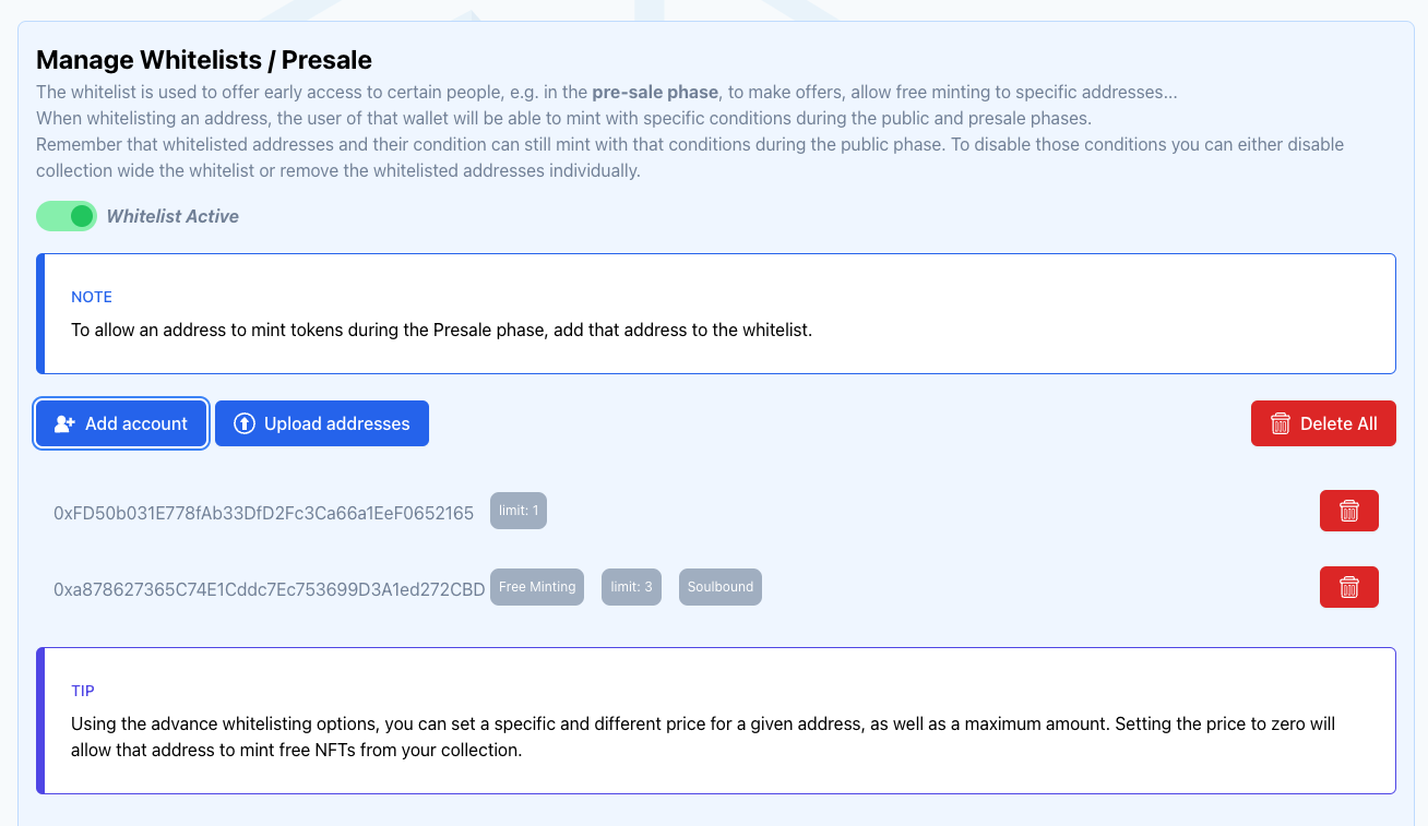 When whitelisting an address, the user of that wallet will be able to mint with specific conditions during the public and presale phases. Remember that whitelisted addresses and their condition can still mint with that conditions during the public phase. To disable those conditions you can either disable collection wide the whitelist or remove the whitelisted addresses individually.