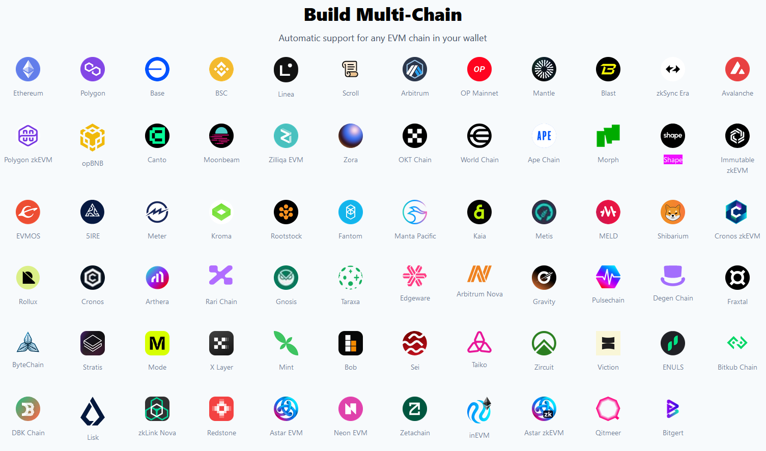 Currently, we support the main EVM Blockchains: Ethereum, Linea, Polygon, Polygon zkEVM, zkSync (ERA) from Matter Labs, Arbitrum, Optimism, Avalanche, BSC (Binance Smart Chain), Base (from Coinbase), Scroll, Mantle, Blast, Canto, Fantom, Manta Pacific, Klaytn, Moonbeam, Zilliqa EVM, Zora, OKXC / OKT Chain, EVMOS, Soros, Meter.io, PGN (Public Goods Network), Rootstock (RSK), Metis Andromeda, Shibarium, opBNB, Nautilus, Rollux L2, Cronos, Edgeware EdgeEVM, Neon EVM (Solana L2), ZetaChain, Qitmeer, Bitgert, Binance Smart Chain (BNB Smart Chain), Gnosis, Rari Chain, Taraxa, Astar zkEVm, Arthera, Worldchain, Ape Chain, Morph, Shape, Immutable zkEVM, 5IRE, Kroma, Kaia, Gravity, Pulsechain, Degen Chain, Fraxtal, ByteChain, Stratis, Mode, X-Layer, Mint, Bob, Sei, Taiko, Zircuit, Viction, Enuls, Bitkub Chain, DBK Chain, Lisk, zkLink Nova, Redstone, Astar EVM and inEVM. As well as some Testnets like Sepolia, Holesky, Polygon Amoy, Immutable zkEVM Testnet, Taiko Hekla Testnet, Abstract Testnet, Unichain Sepolia Testnet, Kakarot Starknet Sepolia, Form Testnet, Berachain bArtio Testnet, Zircuit Testnet, Gnosis Chiado, Stratis Auroria Testnet, StratoVM Sepolia Testnet, Superposition Testnet, Chainbase Testnet, Story Testnet, Movement EVM Testnet, Sonic Testnet, Unreal Testnet, Morph Holesky Testnet, Soneium Minato Testnet and Joltify Testnet.