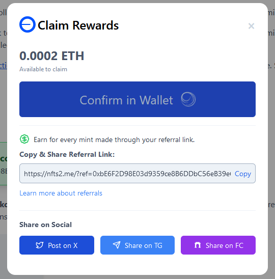If you're generating a referral link for a specific collection, the modal will display the commission you will earn for each mint in that collection. Additionally, the link will direct users to the minting page of the collection