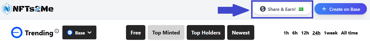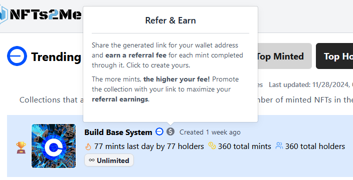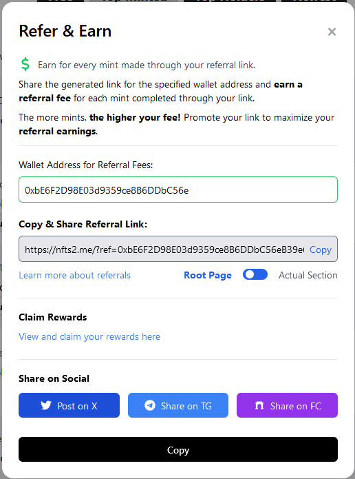 Alternatively, you can generate a referral link for the entire Trending Collections page, ensuring you earn from any minting activity initiated from there. Any mint performed through this link, across any collection, will generate a referral fee for you.