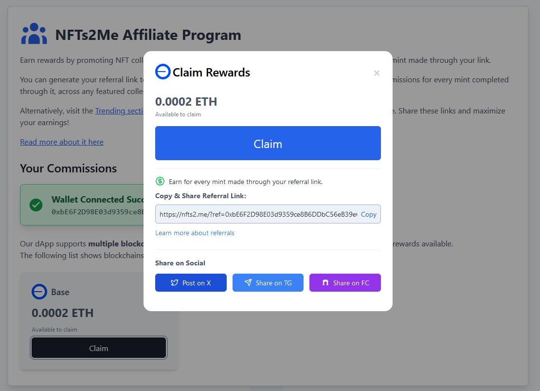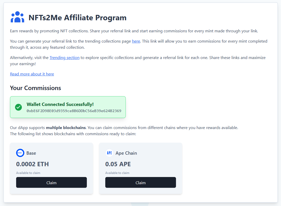 Once you’ve connected your wallet, it will indicate that the connection was successful and display your wallet address. The page will then retrieve the commissions available for this wallet across all blockchains, as we are a multichain application, allowing you to share referral links for collections across multiple blockchains.