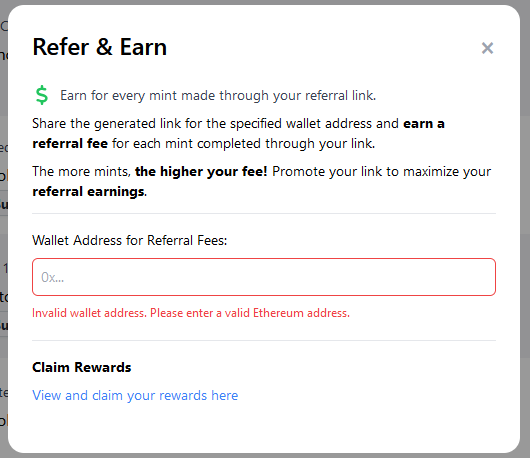 If the page you're on doesn't have your wallet connected, the modal will prompt you to enter the wallet address you want to use to generate the referral link. All commissions earned through the link will be directed to that address. This field validates that the input is a valid wallet address.