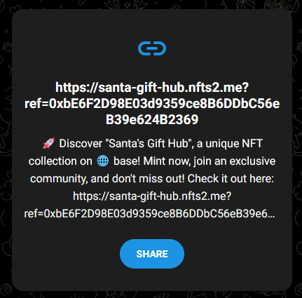 <figure><img src="https://3026745716-files.gitbook.io/~/files/v0/b/gitbook-x-prod.appspot.com/o/spaces%2FsfdCMm7uC0GmVAWnxMdG%2Fuploads%2Fgit-blob-5fbccdf68e0b930907711c3fbee75d1d5e61a063%2Fimage.png?alt=media" alt=""><figcaption><p>Sharing the link on TG</p></figcaption></figure>