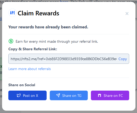 Once you click the 'Claim' button, a modal will appear where you’ll need to click 'Claim' again. In this modal, we’ll remind you of your referral link for the Trending Collections page, and you’ll also have options to share your link on social media.
