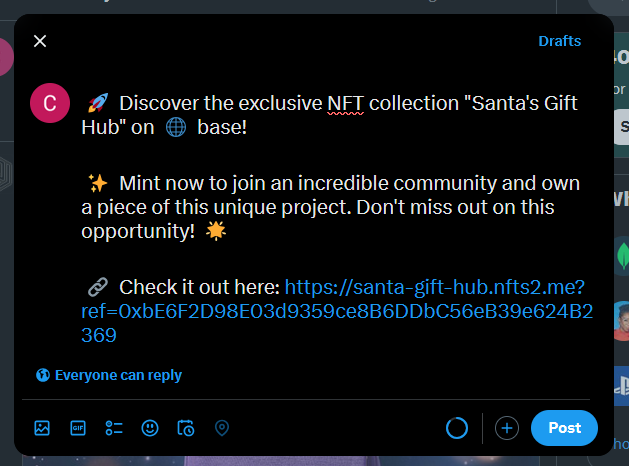 <figure><img src="https://3026745716-files.gitbook.io/~/files/v0/b/gitbook-x-prod.appspot.com/o/spaces%2FsfdCMm7uC0GmVAWnxMdG%2Fuploads%2Fgit-blob-aa3620d0b7deb29d7884dfbc60dc14bc10a80d89%2Fimage.png?alt=media" alt=""><figcaption><p>Post the link on X</p></figcaption></figure>
