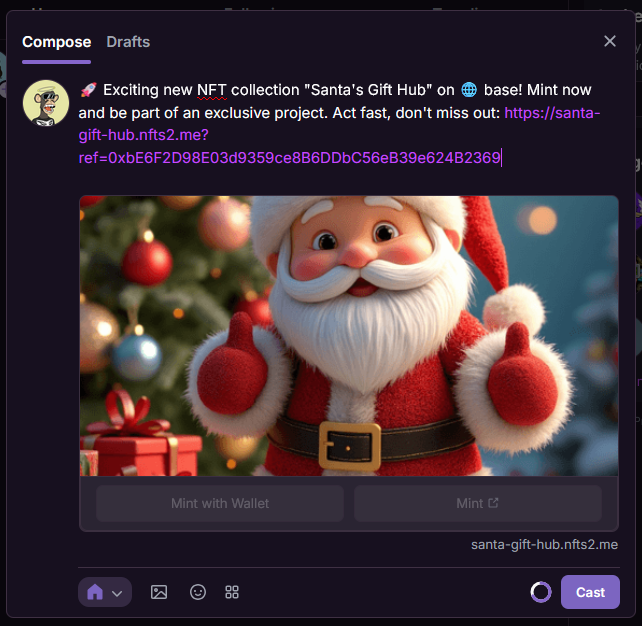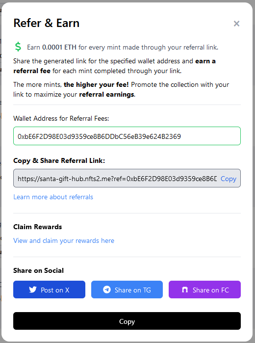 Generate a **referral link** tied to your **wallet address** and earn a **referral fee** for **every mint** completed through your link. This is **available** for **any collection**.