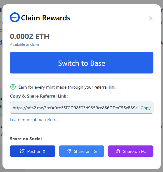 At the bottom of the modal, you'll find a section to share your link on social media. This allows you to share your referral link on X, Telegram, and Farcaster.