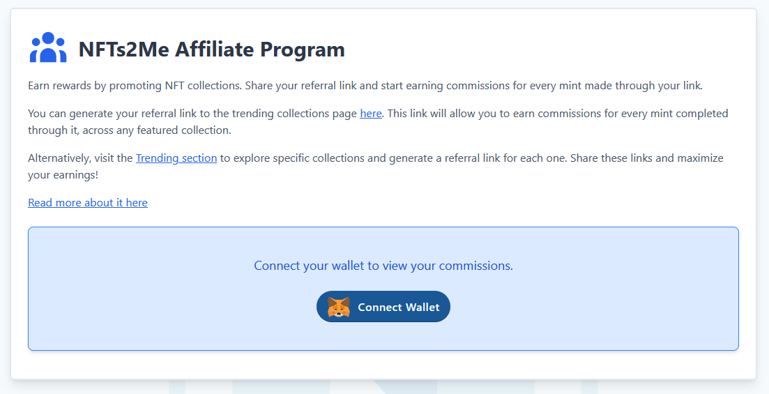 Create a referral link for any specific NFT collection on NFTs2Me. Share your link to invite others to mint from that collection, and you'll earn a referral fee for every successful mint. You can get the collection's referral link in two different places: