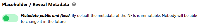 At the moment you want to reveal both the image and metadata, you only have to go to the "Mint Settings" option on your project dashboard. Scroll down to arrive at the "Metadata/Placeholder" section: