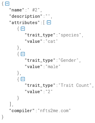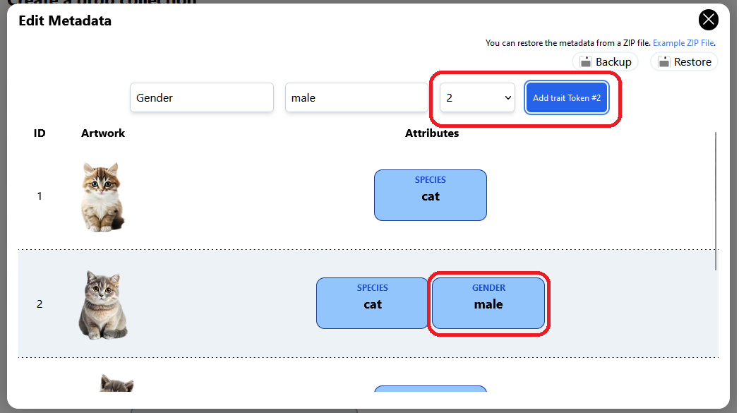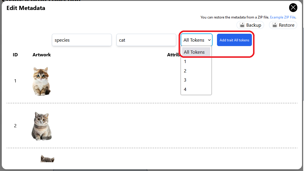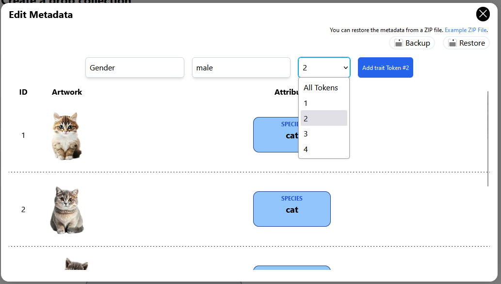 On the other hand, if you want to add a metadata attribute to a specific token, you are able to. Fill in the metadata attribute fields and then select the token ID. Then, an "Add trait Token #" button is shown, and you just need to click on it to add that attribute. As you can see below, that trait is only added to the specified token (#2 in this example).