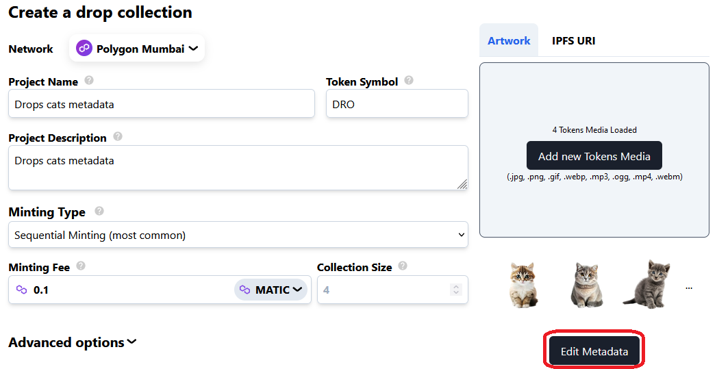 At this type of project, users have to manually set the metadata attributes for their artworks. Regardless of the collection type, you can specify the metadata for each token individually. This means you can either specify metadata for each token individually or apply common metadata to all tokens.
