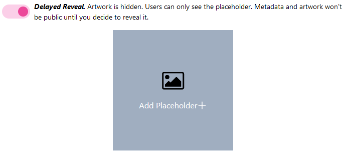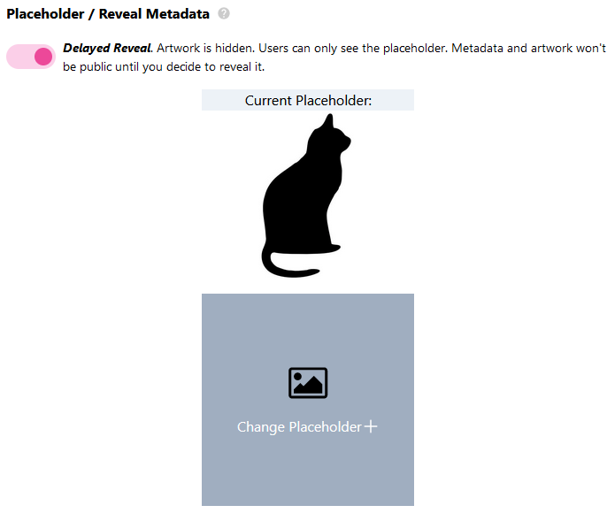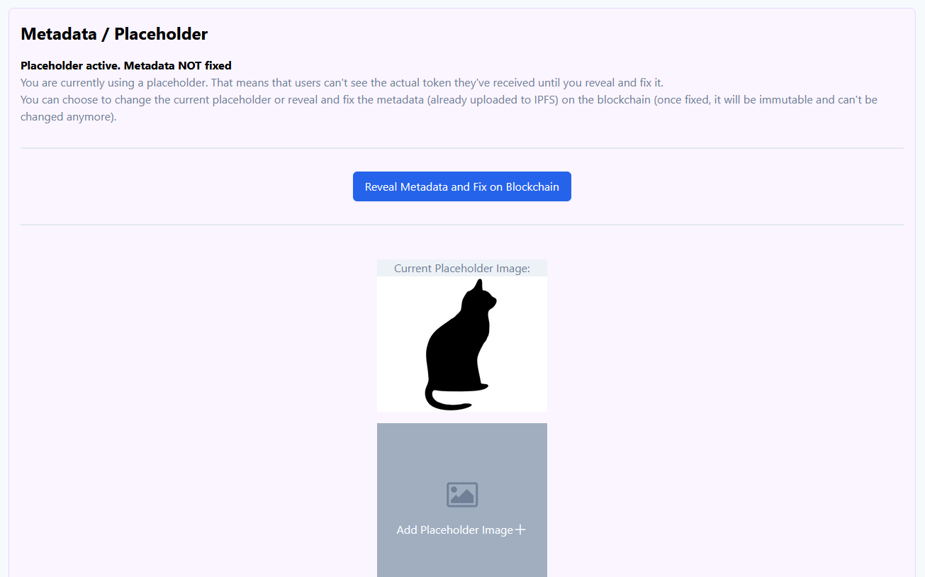 The placeholder is a temporary image and metadata displayed for every NFT in your collection. It serves as a way to hide or delay the actual images during the minting phase. You can choose when to reveal the actual metadata. We don't upload any on-chain information until you decide to do so. However, once uploaded, it can't be changed.