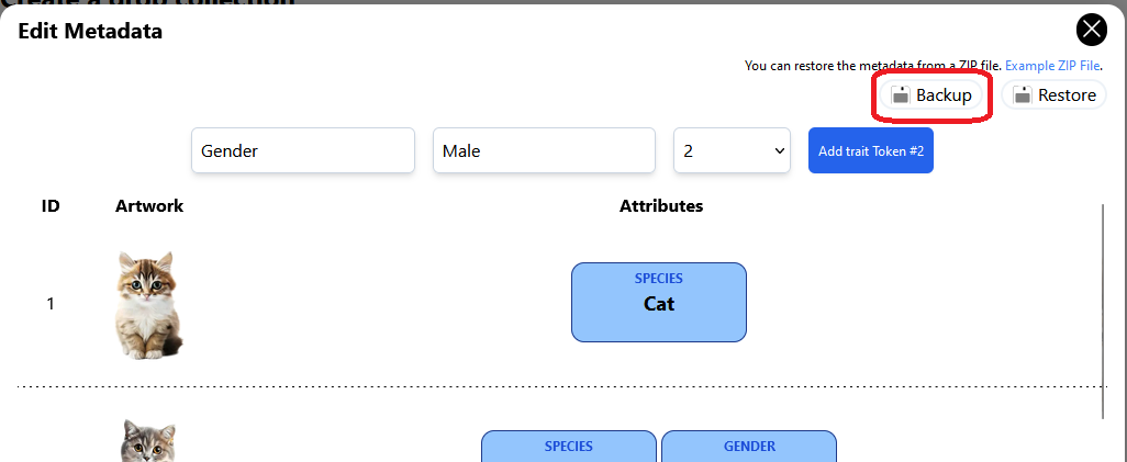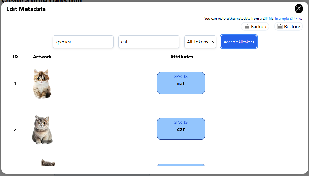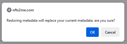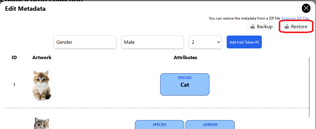 As mentioned earlier, you can restore saved metadata to another collection or to deploy the same collection once more. To do that, you only have to click on the "Restore" button after the artwork has been uploaded. Remember to click on the "Edit metadata" button to display the metadata modal.