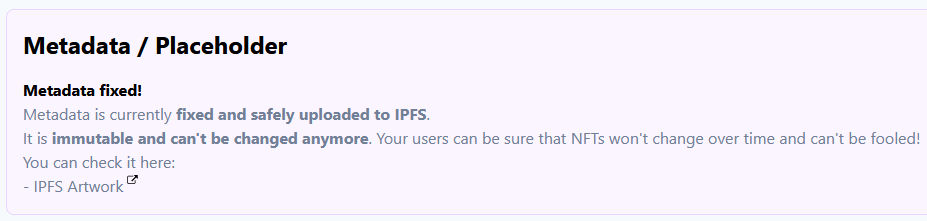To reveal the information, click on the "Reveal Metadata and Fix on Blockchain" button. This action will fix that information on the blockchain associated with your collection contract. You have to confirm it in your wallet and wait while the metadata is revealed and fixed to the blockchain.