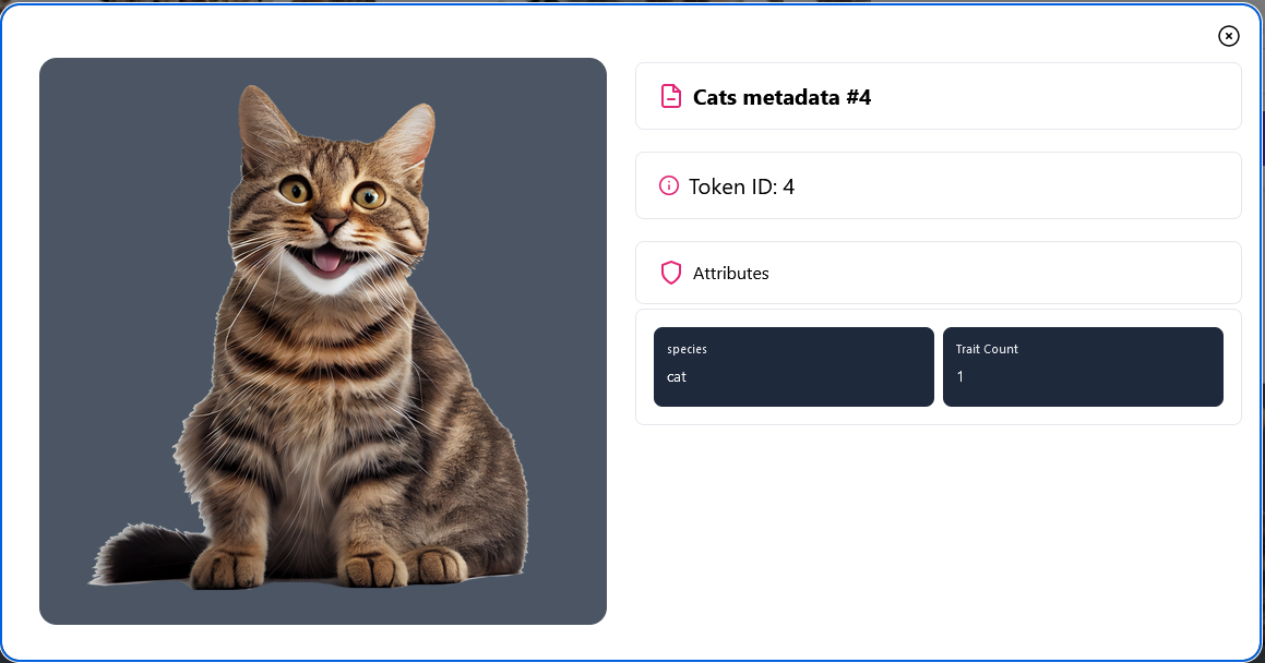 Once the collection is deployed, tokens' metadata attributes will be displayed in the token detail modal. Click on a token to display that detail modal.