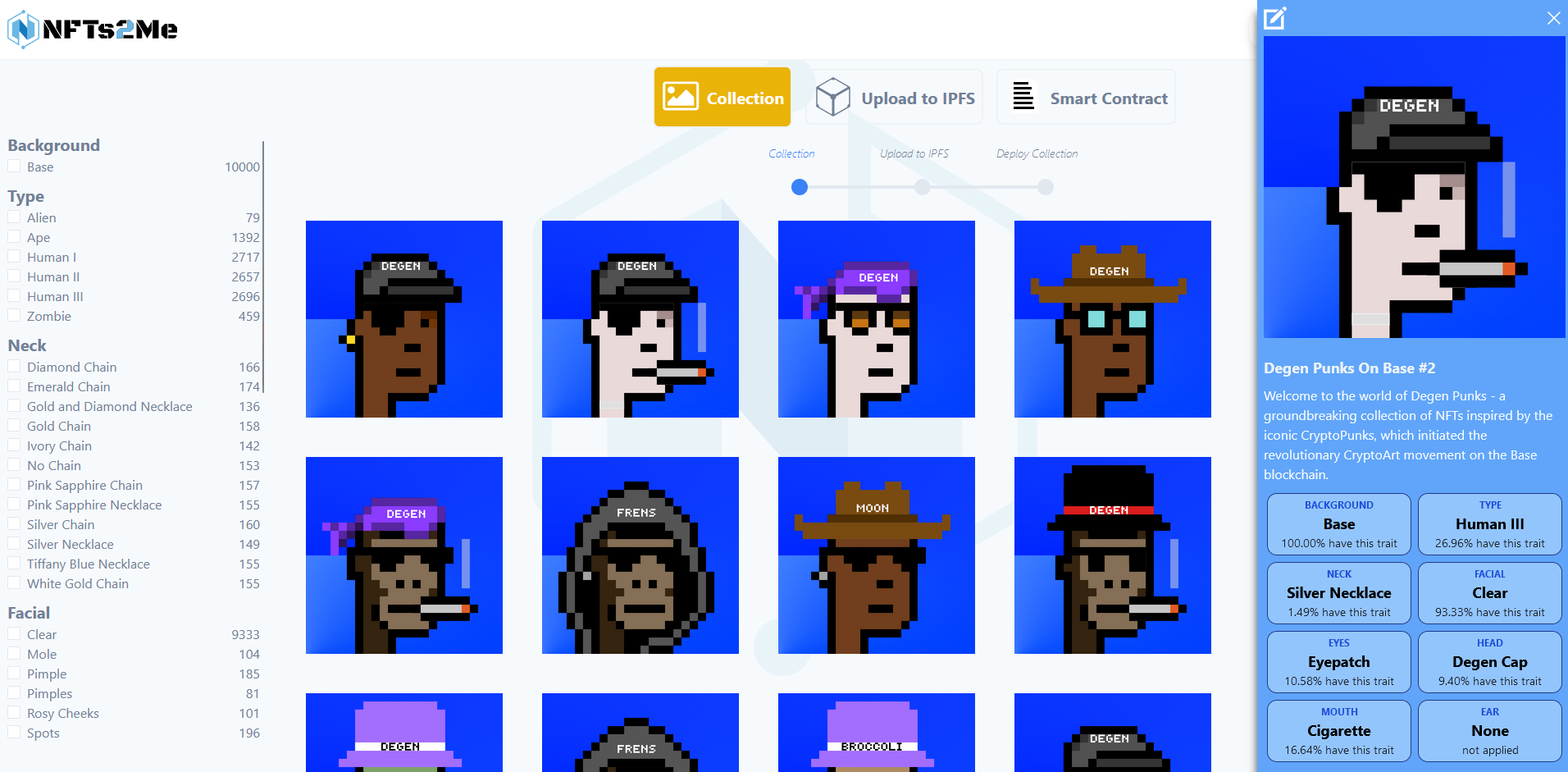 The tool automatically generates a trait for each layer, setting the value defined by the layer and determining the rarity of the trait.