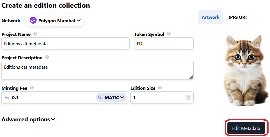 1. Firstly, after adding media, we will encounter an "edit metadata" button. Below, we can observe this in both the "Editions" and "Drops" collection types: