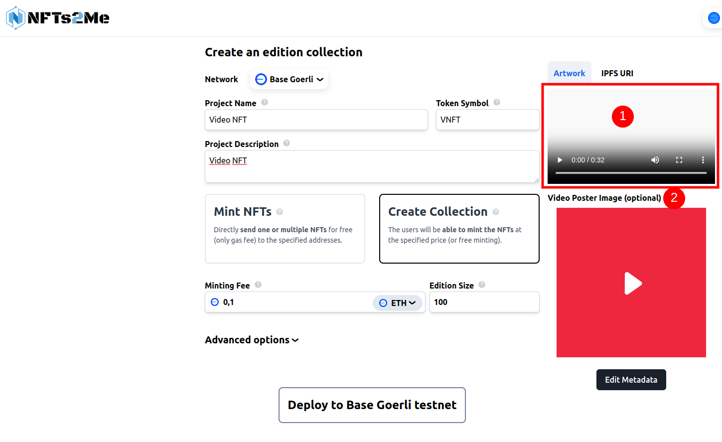 Once you've uploaded the file/s, you will be able to set **video metadata**. You can learn how to use this tool [here](https://docs.nfts2me.com/nft-media-types/media-metadata).