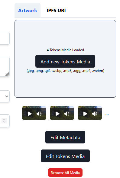 Uploading video files, like WEBM or MP4, to the Artwork section of your NFT project is a straightforward process. Depending on the project type, you can add multiple videos or just one: