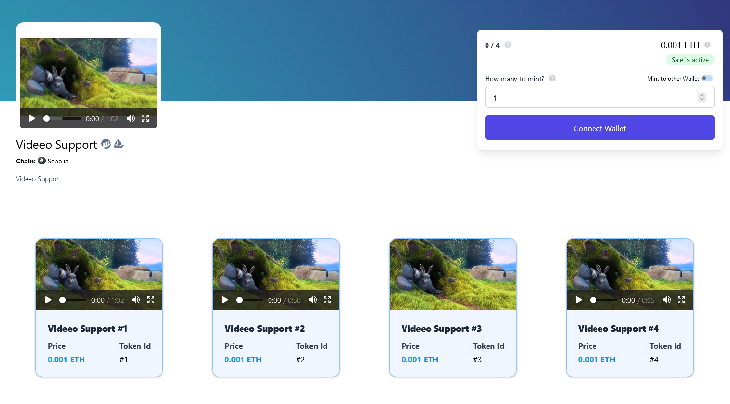 Finally, when you finish deploying the collection, you will see all uploaded video files converted to NFTs on the Minting page.
